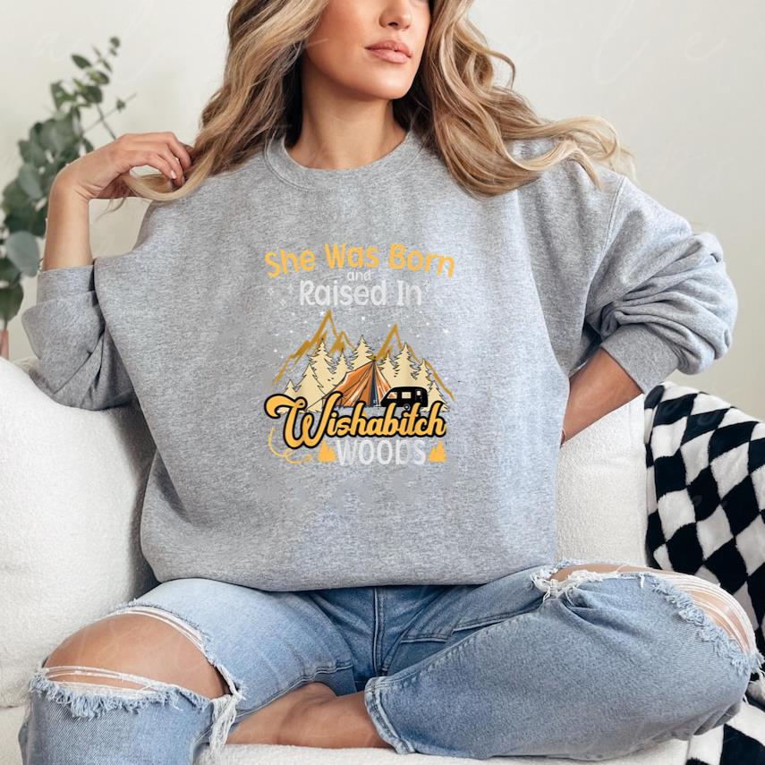 • Camping She Was Born And Raised In Wishabitch Woods Sweatshirt